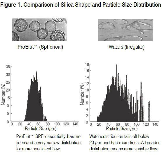 ProElut™ SPE uses spherical silica with high purity and narrow particle size distribution as support. The spherical silica with fewer fines gives a more regular, stable and reproducible chromatography bed that gives a faster, more even flow rate for better separation. Fines cause back pressure increases that can result in clogging and can pass through filters and contaminate the final product. A narrower particle size distribution will give a more homogenous packing that will help in collecting more concentrated fractions and reducing solvent consumption to achieve higher recovery and reproducible results.