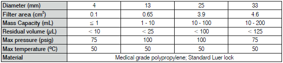 ProMax™ Syringe Filters Specifications