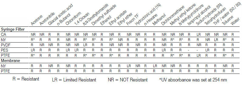 | Nylon (NY) | For general sample and solvent filtration. Nylon has inherent hydrophilic characteristics and works well with aqueous as well as most solvent-based samples. Nylon is excellent for most HPLC and GC sample and solvent preparations |